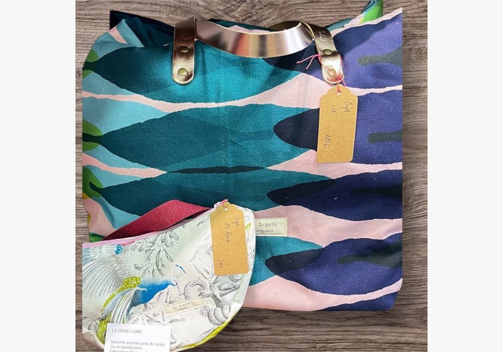 J’y présente mes collections de sacs, pour le week end ou le quotidien, et de trousses, fabriquées majoritairement en tissus français.