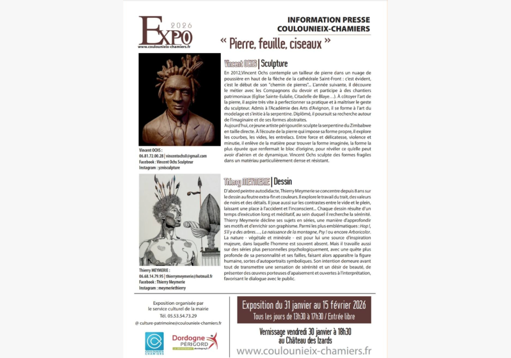 Du 31 janvier au 15 février 2026, la ville de Coulounieix-Chamiers accueille l’exposition Pierre, feuille, ciseaux, une rencontre sensible entre sculpture et dessin, où dialoguent matière minérale, geste artistique et imaginaire contemporain.