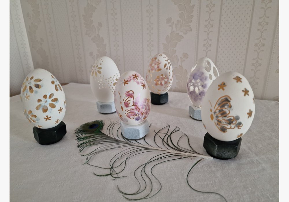Je décore/sculpte/grave des Oeufs, des oeufs d’oies, d’émeus, d’autruches, je réalise des objets décoratifs uniques mais également des luminaires qui prodiguent une atmosphère feutrée et intimiste,