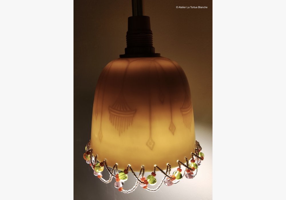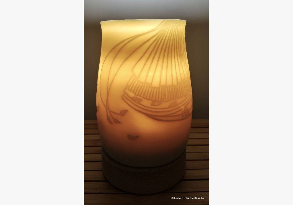 En utilisant une technique de réserves, appelée gravure à l’eau, j’obtiens des bas-reliefs au plus près de mes graphismes et progresse vers davantage de translucidité.