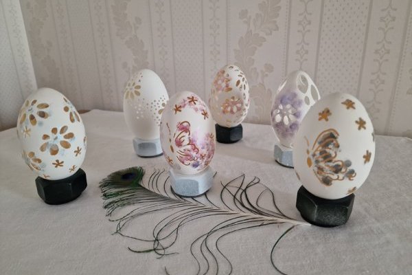 Je décore/sculpte/grave des Oeufs, des oeufs d’oies, d’émeus, d’autruches, je réalise des objets décoratifs uniques mais également des luminaires qui prodiguent une atmosphère feutrée et intimiste,