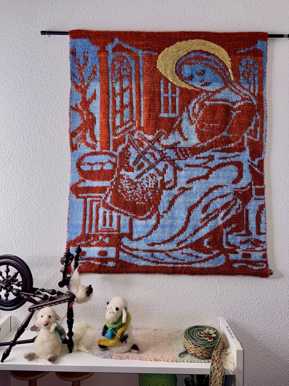 C’est ce que je m’efforce de retrouver lorsque je crée une Tenture. Je réfléchie et choisie ma fibre animale selon les projets. J’utilise la technique de filage au rouet qui correspond au besoin et à la façon dont je vais devoir tricoter cette création. Je ne travaille qu’avec de la laine de moutons (en utilisant différentes races selon leur caractéristiques)